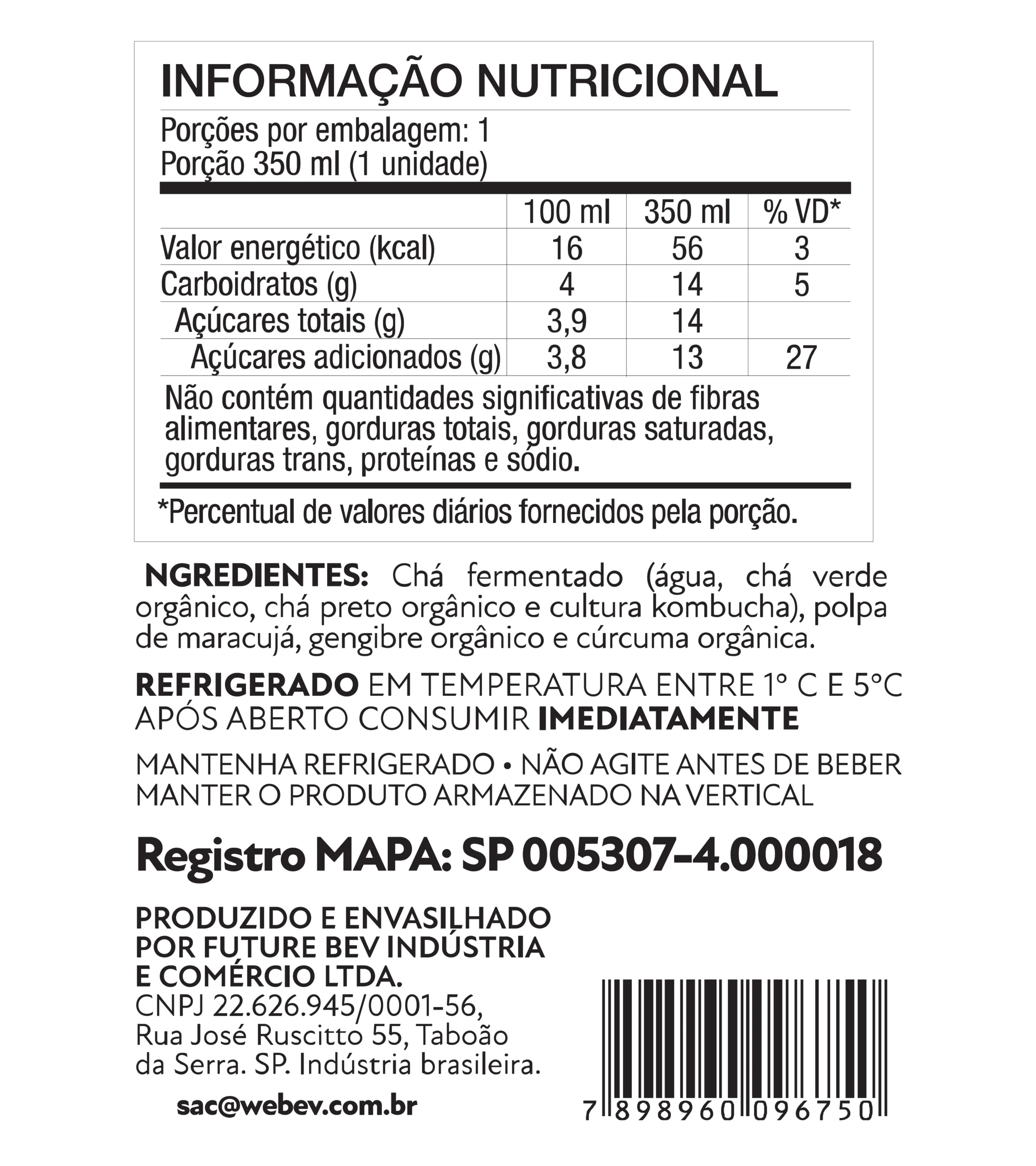A Kombucha Immunity, elaborada com chá verde orgânico, chá preto orgânico, cultura kombucha, polpa de maracujá, gengibre orgânico e curcuma orgânica. Naturalmente fermentada, é uma bebida funcional que fortalece o sistema imunológico e contribui para o equilíbrio digestivo. O blend de cúrcuma e gengibre é altamente antioxidante, auxilia na digestão e no combate a gripes e resfriados, de forma refrescante com baixas calorias.